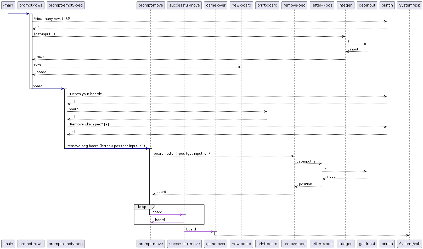 When I realized this, I tried to make a sequence diagram, but got messy really quickly. Some time later I made a second attempt with more success. It shows the board setup with prompt-rows, prompt-empty-peg, and prompt-move in detail. For context I also added the main game loop of Peg Thing: prompt-move, successful-move, and game-over.